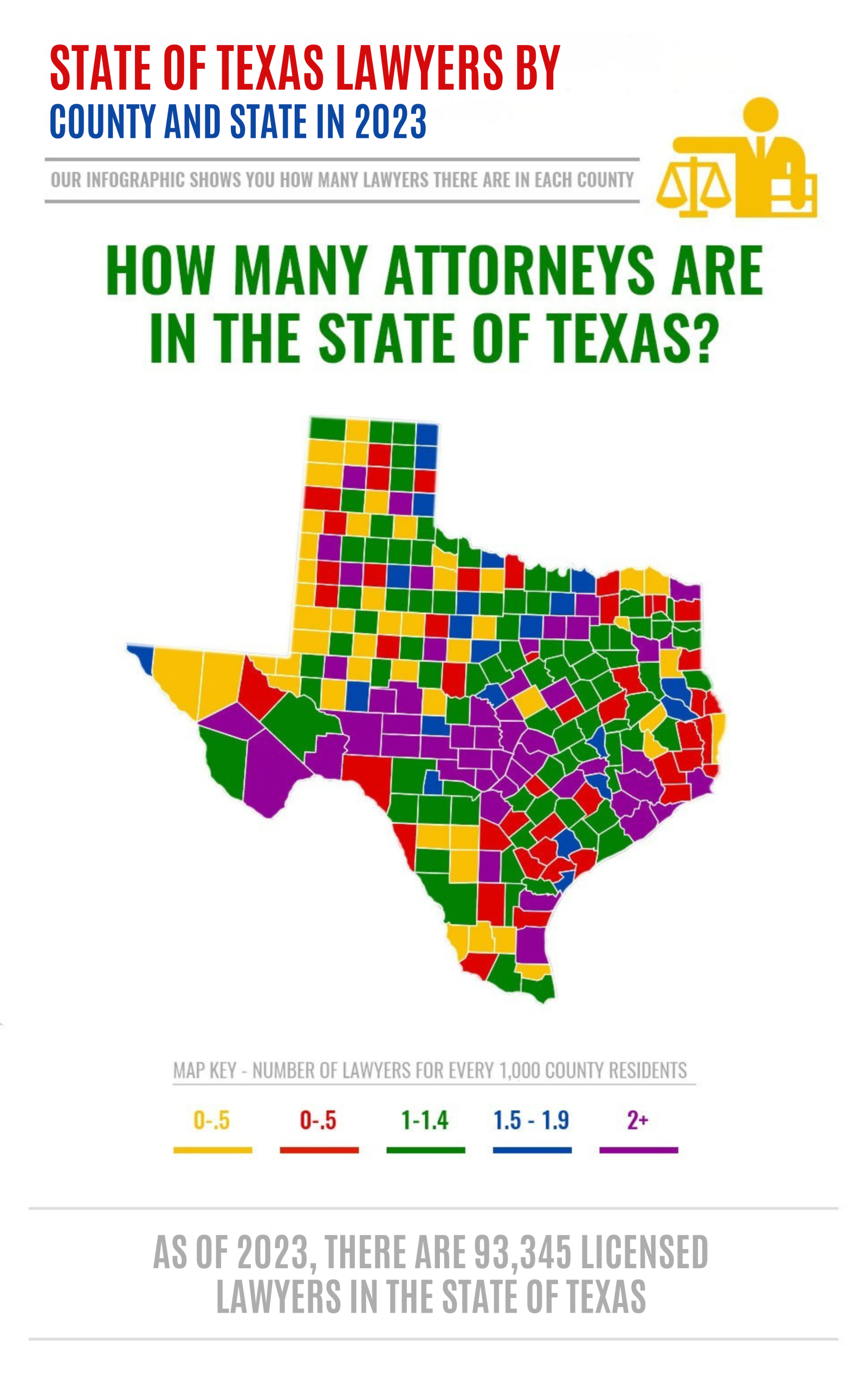 Ever wonder how many attorneys are in the State of Texas? Well, as of 2023, there are 98,345 licensed lawyers in the counties throughout Texas. Our Houston drug crimes attorney Paul Darrow put together an infographic to provide the number of lawyers for every 1,000 county residents.